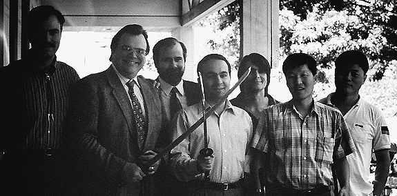 | Left to right: Drs. Don Wunsch, Bob Marks, Bob Streifel, Payman Arabshahi, Russ Reed, Jai Choi and Seho Oh. I was presented swords the stand of which is engraved with "To the Honorable Neural Network Master, Professor Robert J. Marks II, from his warriors; Drs. P.A. (Payman Arabshahi), K.C. (Kwan Cheung), J.C. (Jai Choi), Z.L. (Zhi Li), D.P. (Dong Chul Park), R.R. (Russell Reed, and) D.W. (Donald Wunsch)", August 1996. |