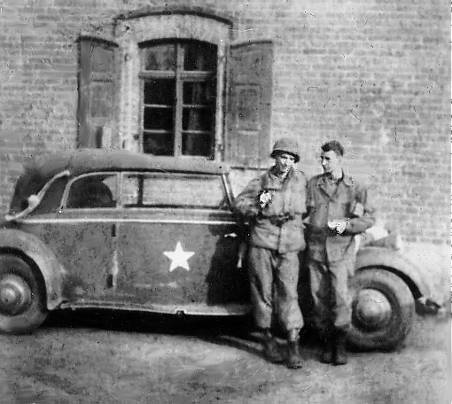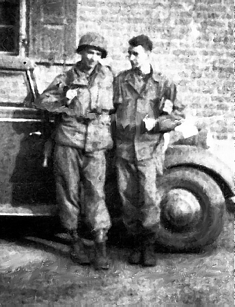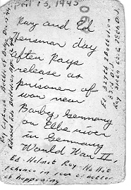 Ray Hersman (right) was a POW in Nazi Germany during WWII. He was captured by the Nazi's on December 15, 1944 during the Battle of the Buldge. By incredible coincidence of fortune, his brother, Ed Hersman (left), was in the Allied forces who liberated Ray's POW group. This picture was taken on April 13, 1945, a day after liberation. Notes taken on the back of the photo are shown on the right. A second digitally enhanced picture and an untouched scan of the original photo are shown below. |