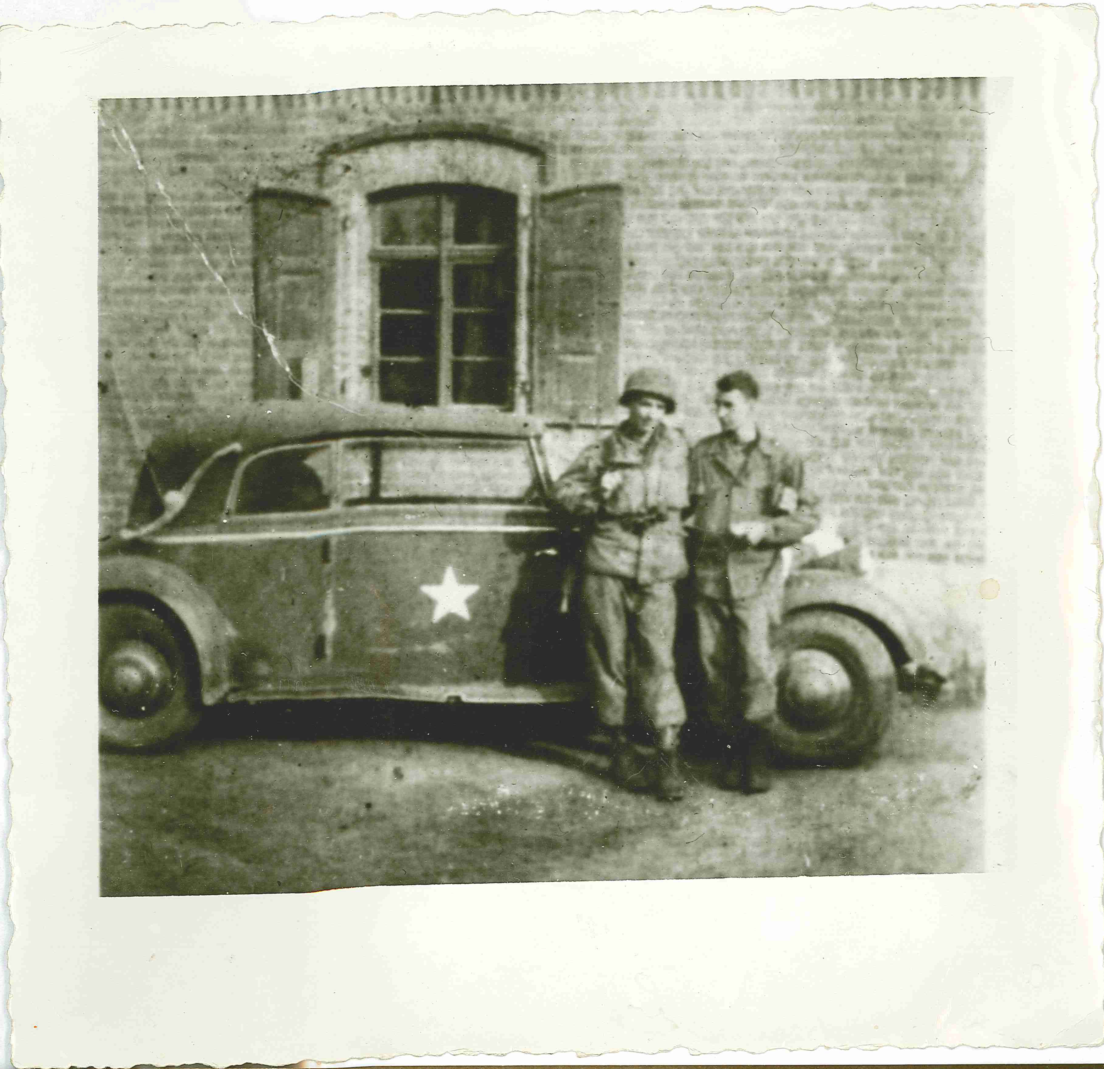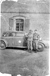Ray Hersman (right) was a POW in Nazi Germany during WWII. He was captured by the Nazi's on December 15, 1944 during the Battle of the Buldge. By incredible coincidence of fortune, his brother, Ed Hersman (left), was in the Allied forces who liberated Ray's POW group. This picture was taken on April 13, 1945, a day after liberation. Notes taken on the back of the photo are shown on the right. A second digitally enhanced picture and an untouched scan of the original photo are shown below. |
