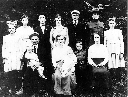 Front: Marion (Randolph's daughter), Ulysses S. Grant Moore & wife Sadie (Ormeda's Parents), Wanda (Randolph's daughter), Pete (Randolph's son), Emmy (Randolph's wife): Back Row - Violet Moore (later Violet Marks), Vivian Moore( Later Mick), Burl Knight (Clarice's husband), Clarice Moore Knight, Vick Moore, Randolph Moore and Ormeda Moore (later Ormeda Marks). Ormeda and Violet - sisters - married Marks brothers. Nellie Moore (later Stoner) not shown. |
